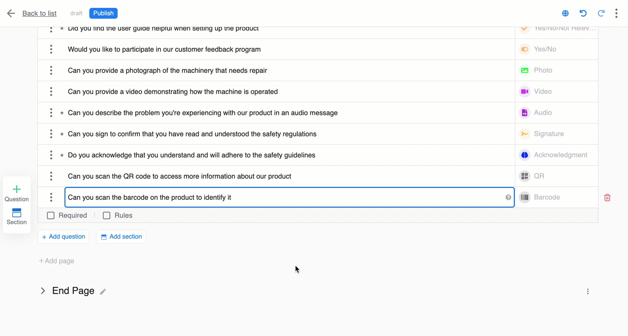 Click on ‘Add question’ button . Choose ‘Barcode’ type from the type list (appears on the right of the screen ). Write your chosen title for the question . Question configuration : Barcode type question has the following optional settings: Required ...